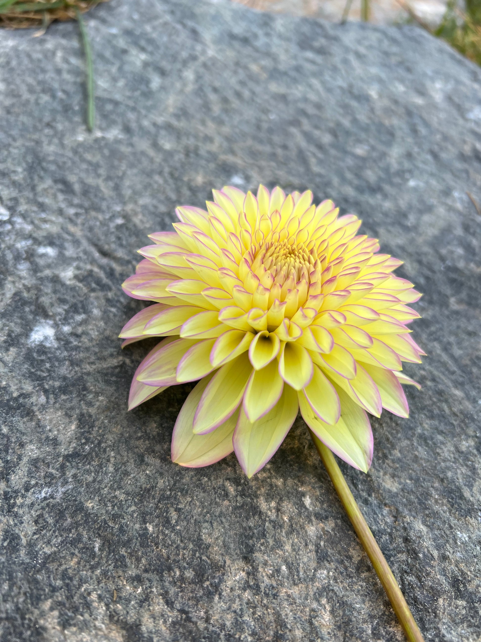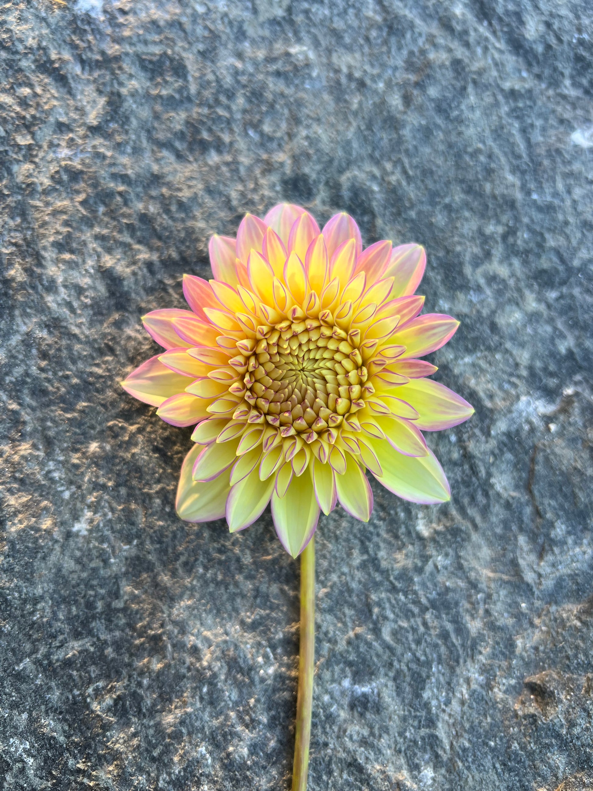 Bloomquist Blush is a stellar-form variety with perfectly symmetrical petals radiating outward, creating a star-like appearance. Its 5–6 inch blooms showcase a delicate yellow base with soft blush pink tips, adding a touch of elegance and refinement. This variety is prized for its precise form and vibrant color gradient, making it a standout choice for floral arrangements and gardens alike.