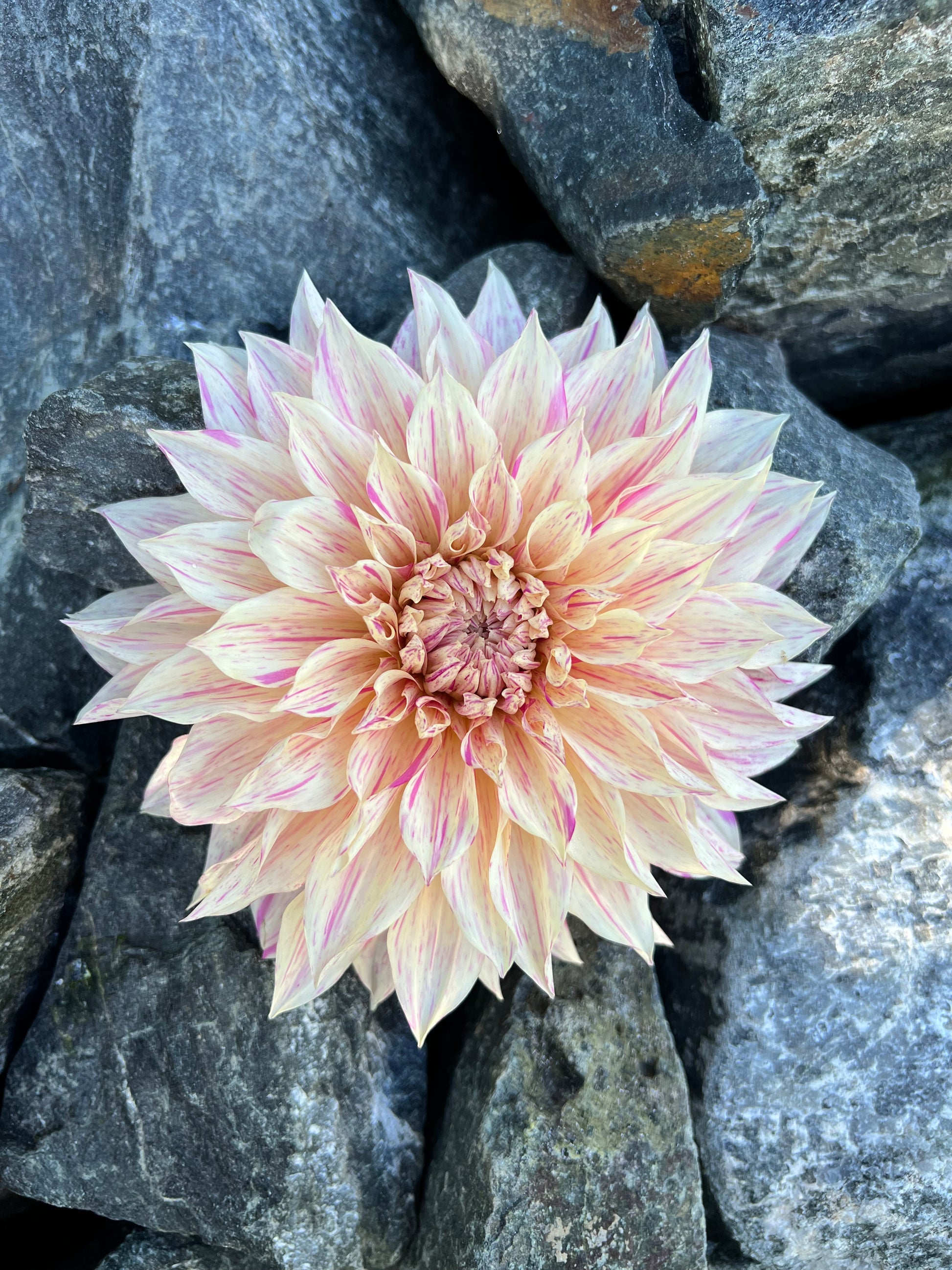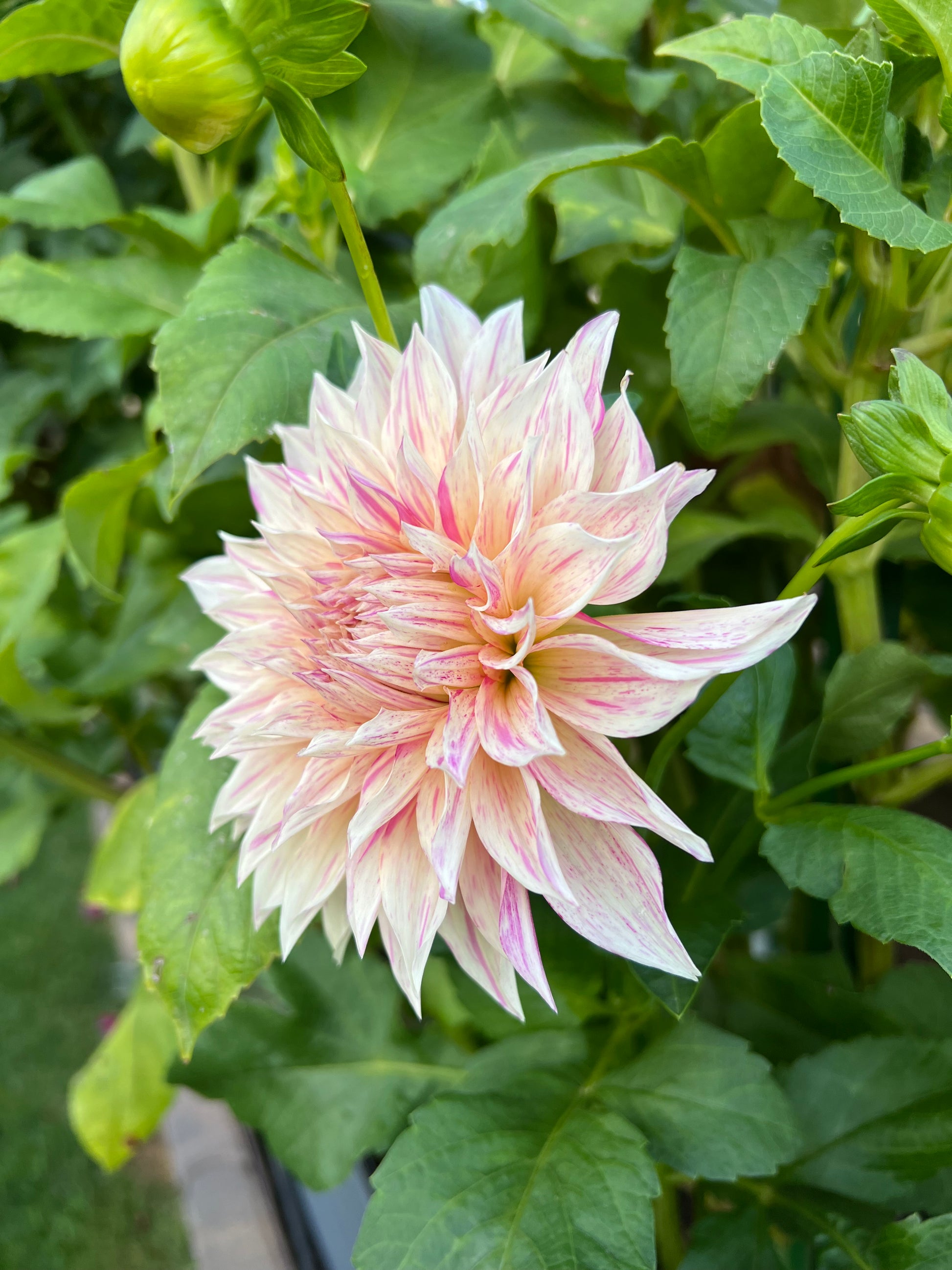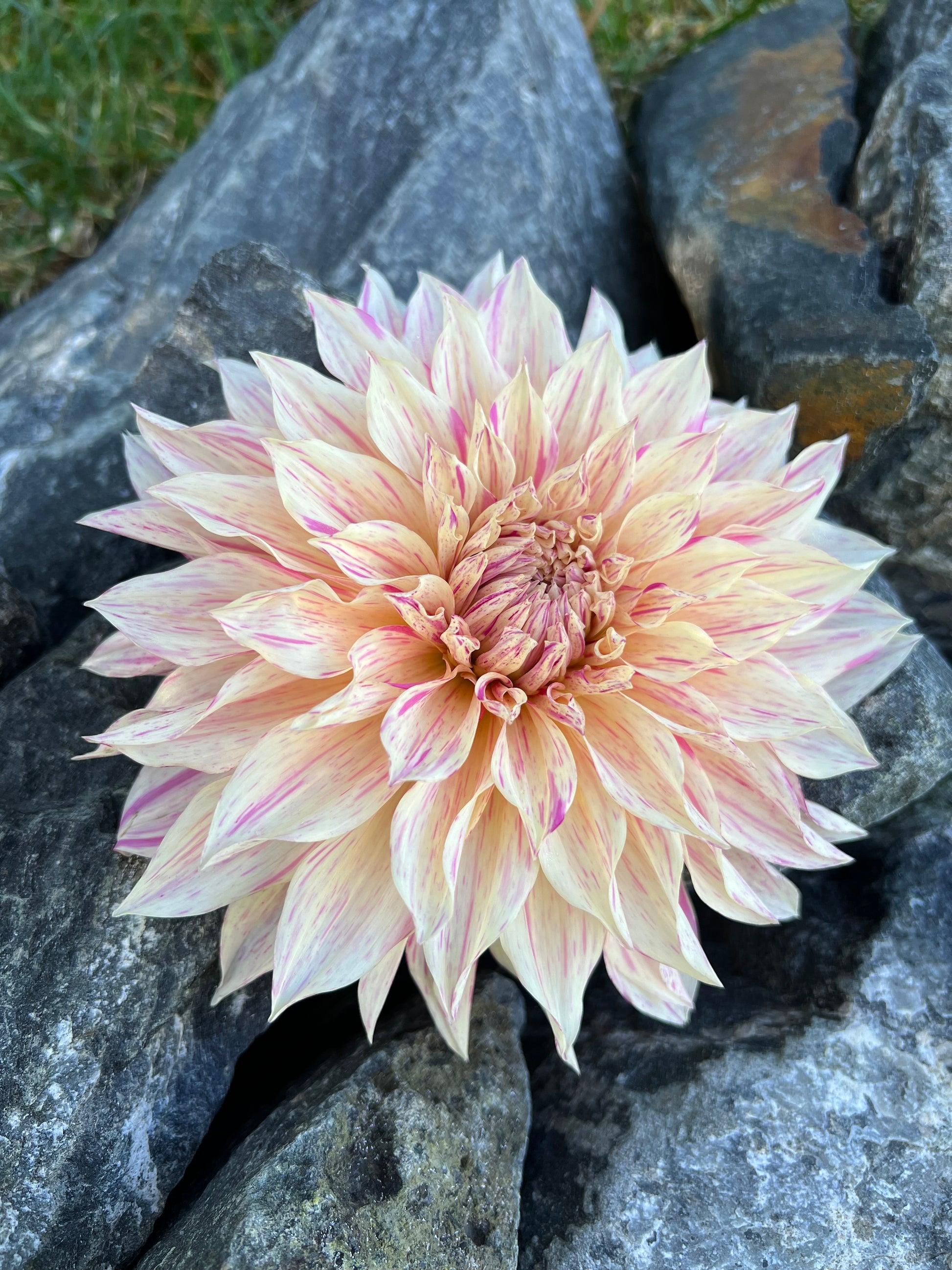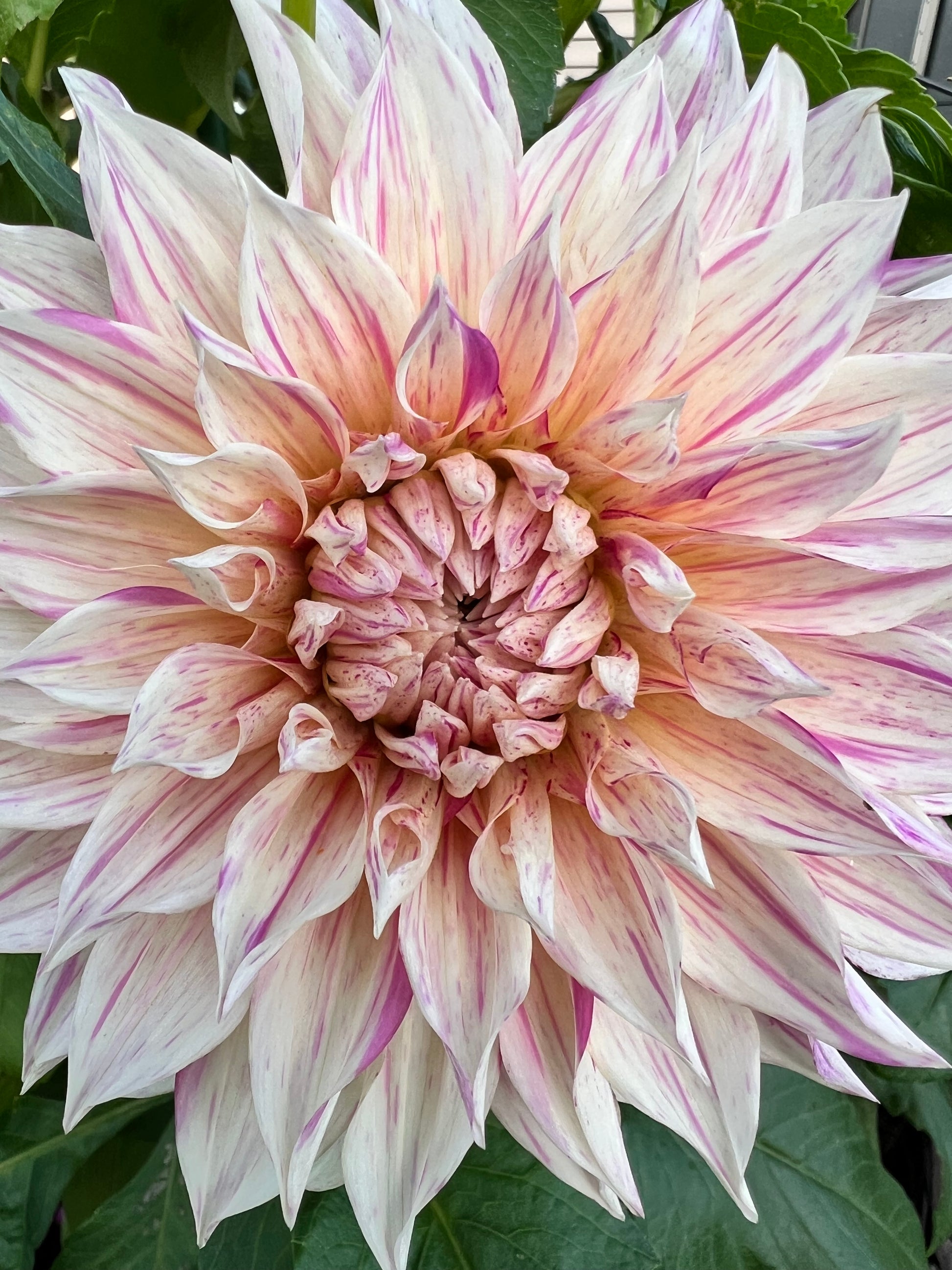 The Café au Lait Twist dahlia is a captivating dinner plate variety with blooms measuring 6–8 inches in diameter. It features an informal decorative form, with creamy petals uniquely streaked and flecked with soft shades of pink, creating a whimsical, marbled effect. This dahlia’s large size and intricate color pattern make it a standout in any garden or floral arrangement, offering a perfect blend of elegance and charm.