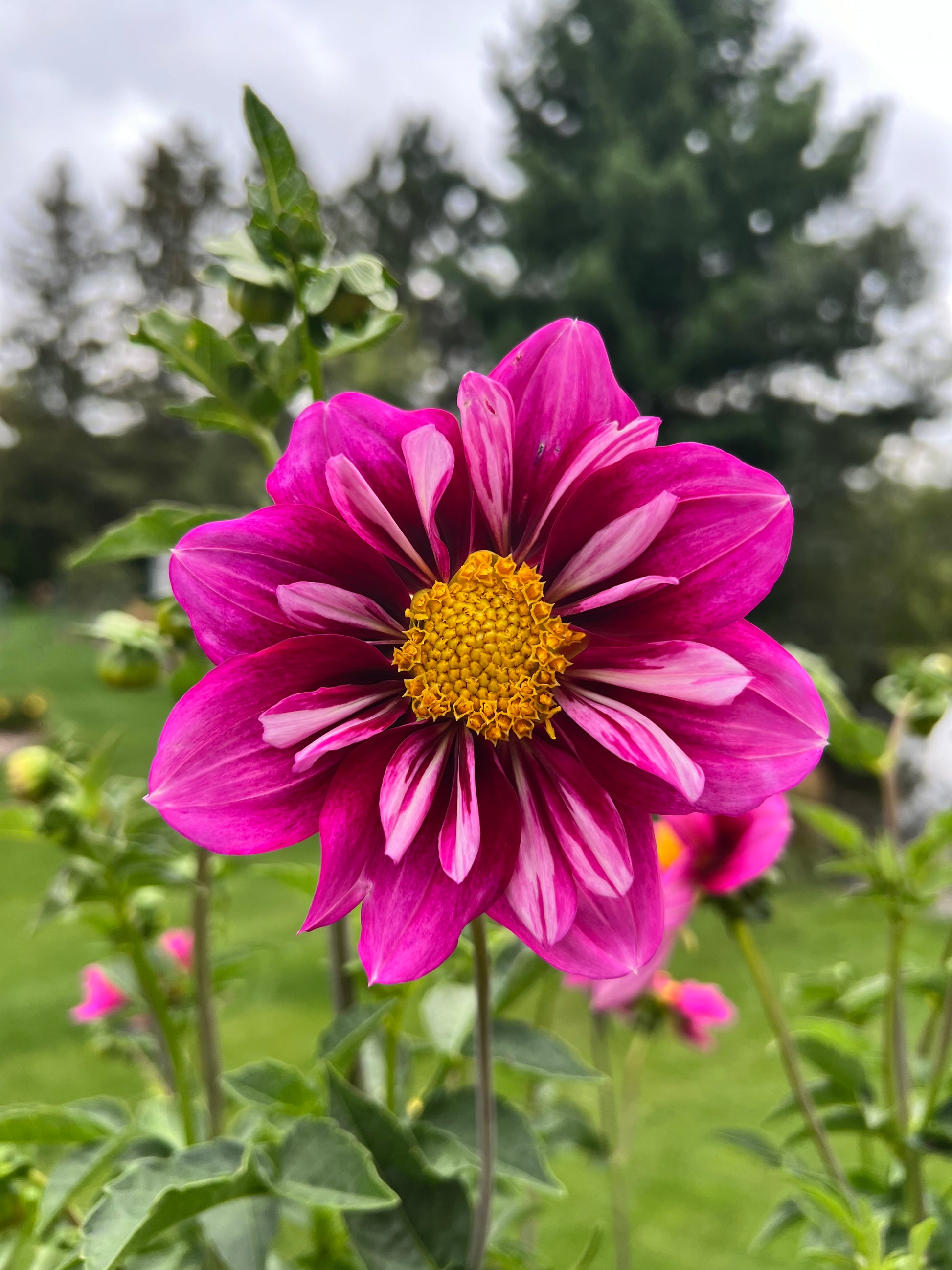 HBG Strawberries and Cream is a vibrant collarette dahlia hybridized by Honey Bee Gardens. Its striking 4.5” blooms showcase bold pink petals complemented by a delicate white and light pink collar, creating a sweet, eye-catching contrast. This epic tuber producer exceeds expectations with both abundant blooms and tuber production. Despite its tall stature, it’s incredibly sturdy, standing strong throughout the season. A favorite among pollinators, bees and butterflies can’t resist its charm, making it a beautiful and beneficial addition to any garden.