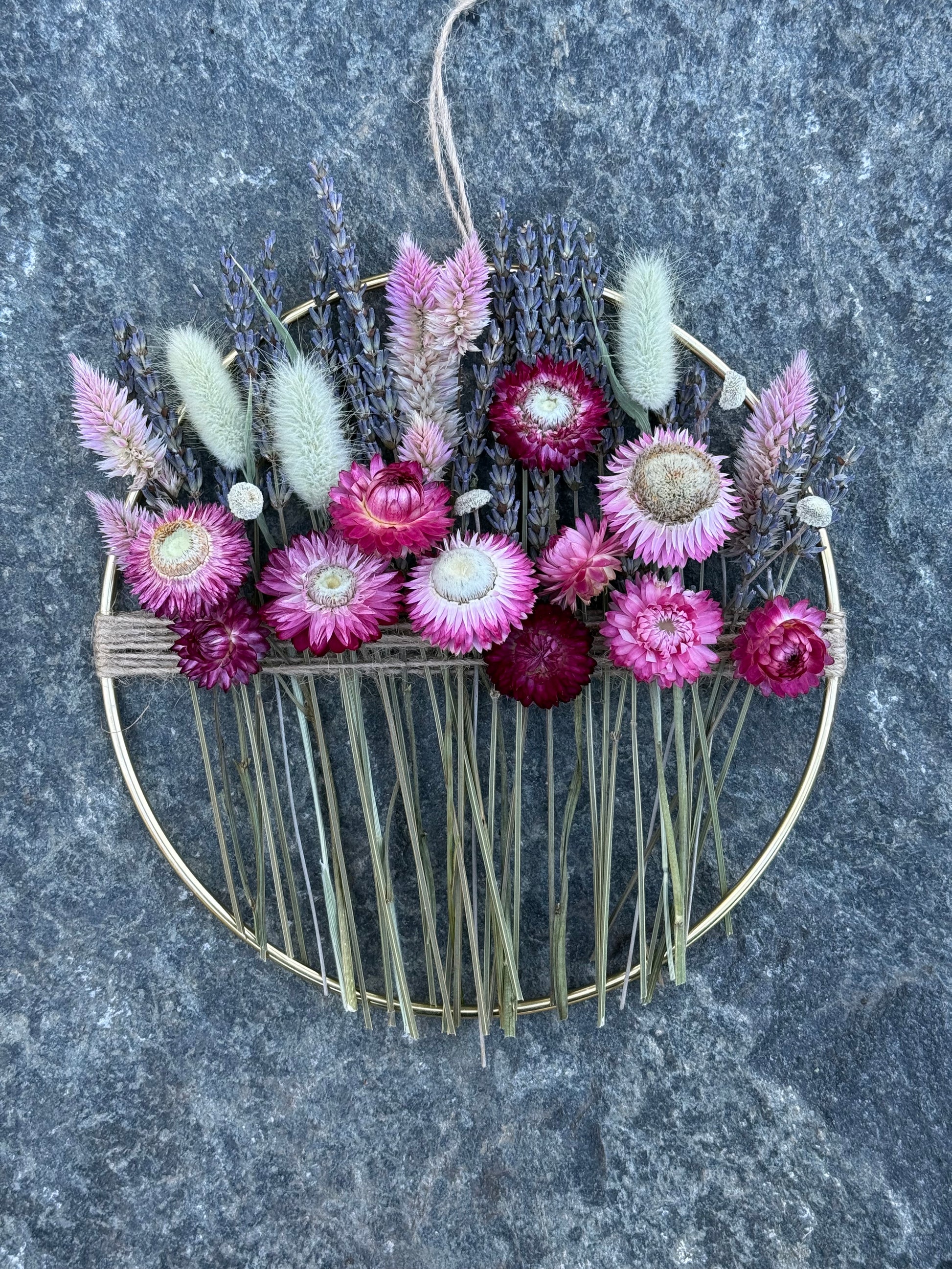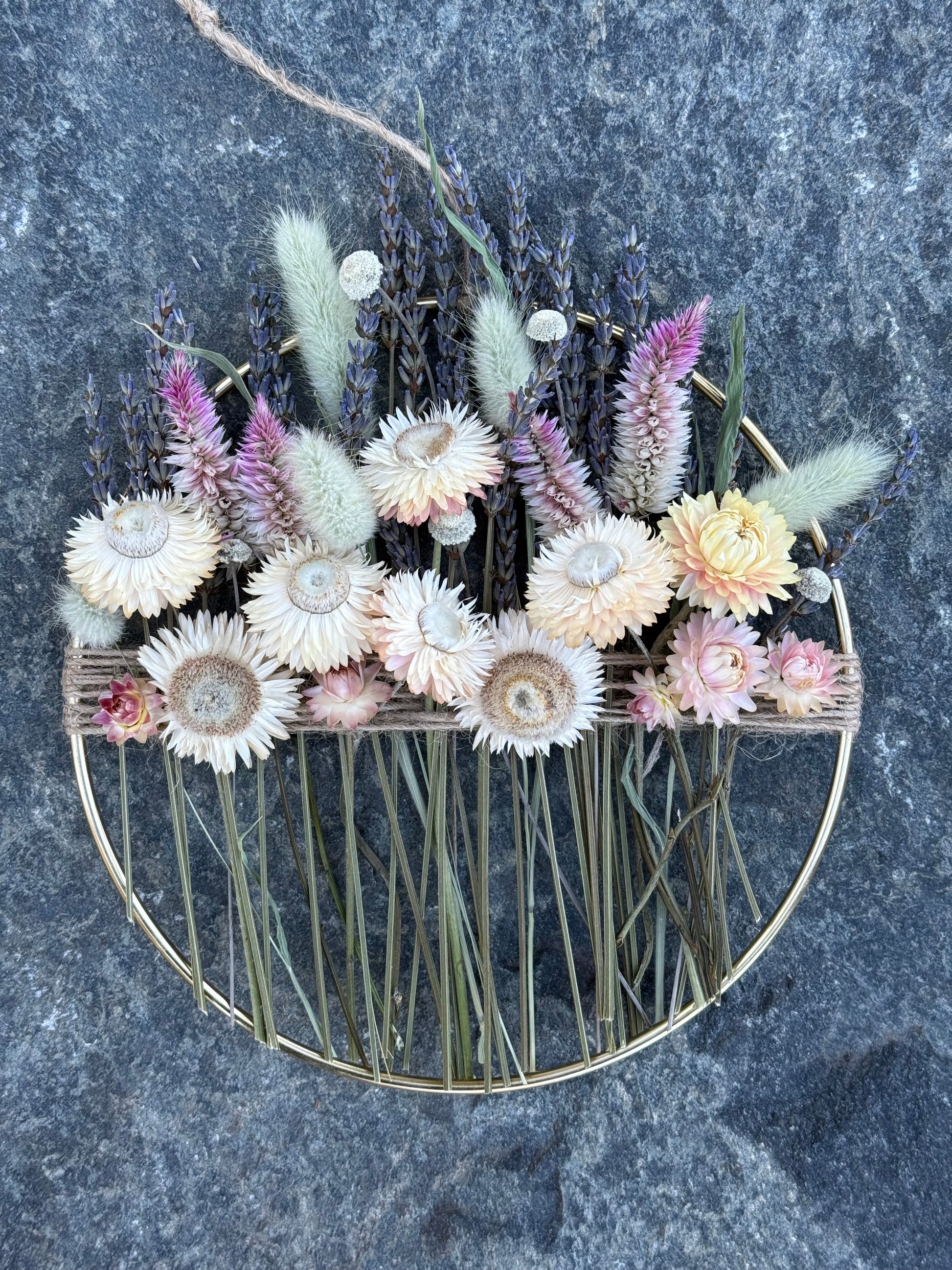- Handle with care: Dried blooms are fragile and may shed if handled roughly. Hold the hoop by the ring or twine loop rather than the flowers.